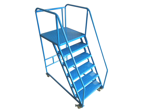 One side of the climbing car is provided with steps (handrails beside the steps) for users to board the platform, and the other side of the platform is provided with guardrails to ensure the safety of operators. The general working surface of the platform can accommodate 1-2 people to stand, rotate and move. The user can stack the goods from the height of the shelf on the platform of the ascending car. In addition, the climbing car is also equipped with casters, which is convenient for users to push and pull. Among them, the front caster is equipped with wheel brake. After braking, the ascending vehicle is fixed and cannot be moved, and the user can safely ascend.